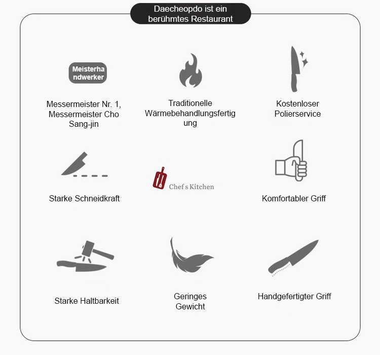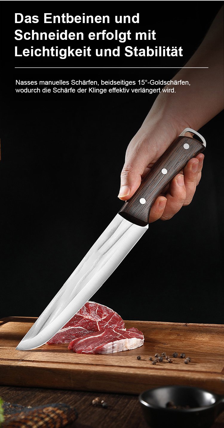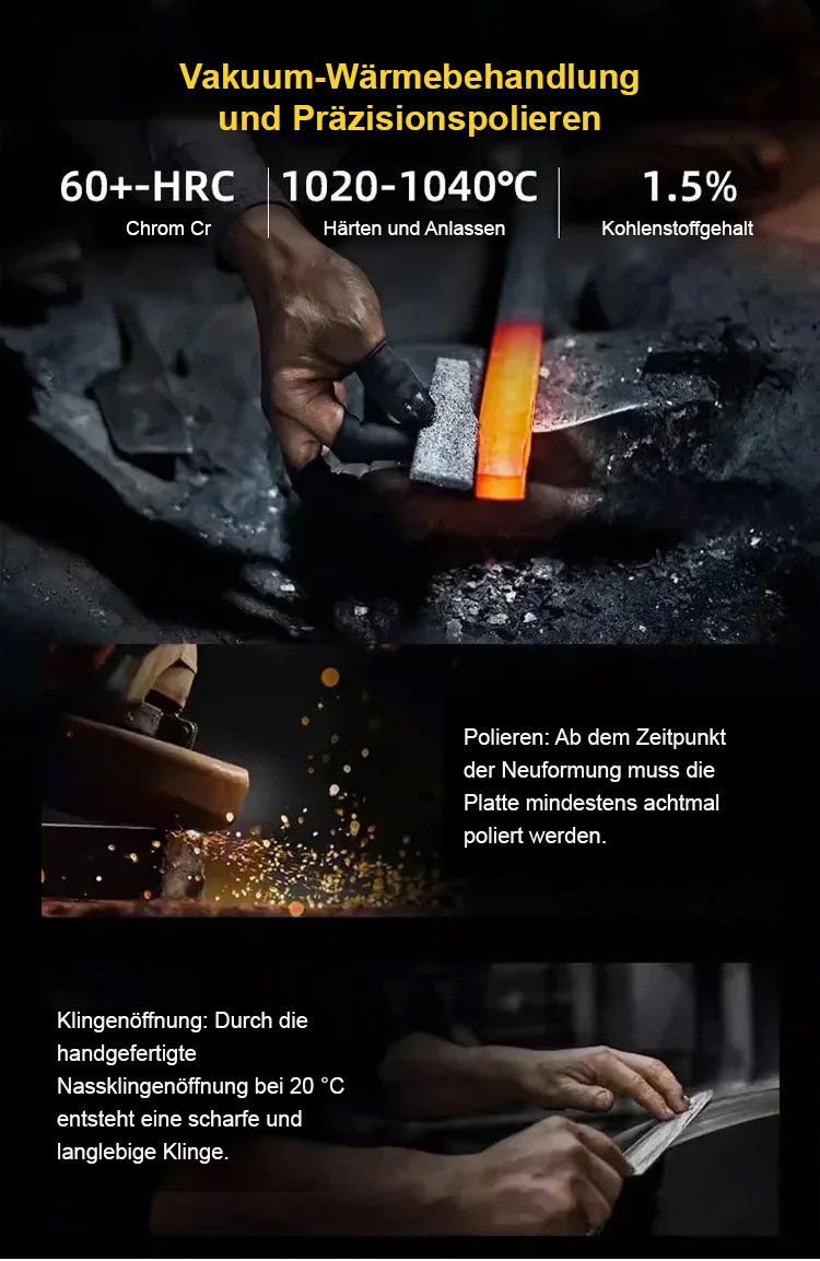 Hergestellt in Solingen, Deutschland. Jedes Messer wird 72 Mal geschmiedet und bietet nahezu keinen Widerstand beim Schneiden.